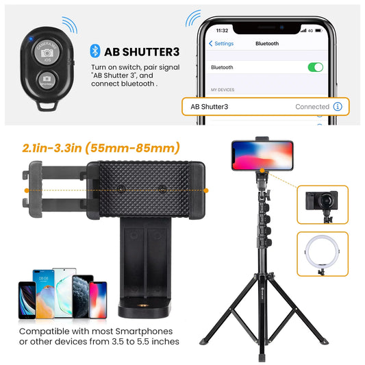 65.3" Phone Tripod Stand Mobile Selfie Tripod Stick with Remote Bluetooth Phone Clamp Travel Lightweight Smartphone Tripod Stand for Cell Phone Compact Camera Ring Light Video Recording Filming